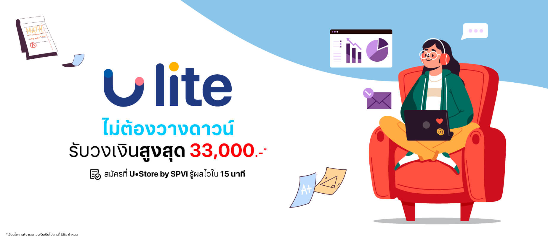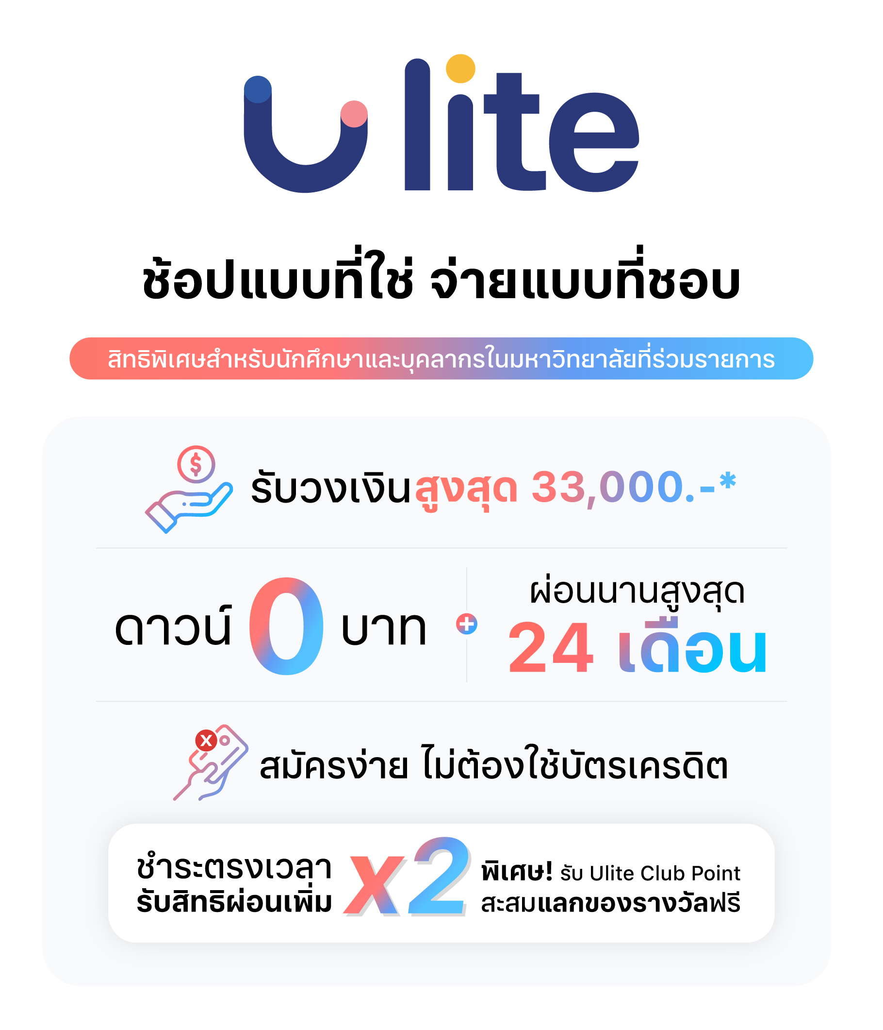 เงื่อนไขการพิจารณา การพิจารณาสิทธิ์เป็นไปตามประวัติการชำระของลูกค้า โดยอาจมีการเพิ่มเติมหรือลดรายชื่อสถาบันการศึกษาตามเกณฑ์ที่ Ulite กำหนด หากลูกค้ามีประวัติการชำระต่ำกว่าเงื่อนไขที่กำหนด อาจไม่ได้รับการอนุมัติ